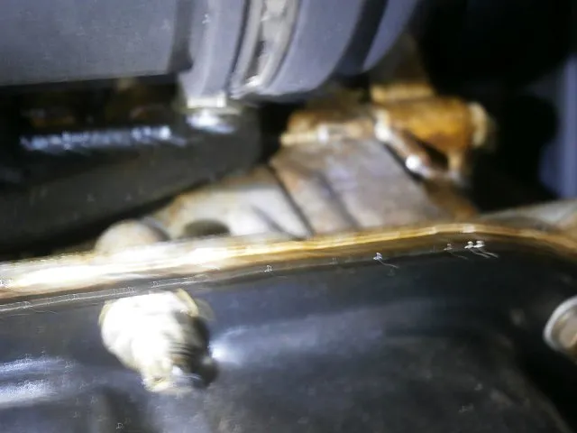 お客様からのご用命で、エンジンからガラガラ音がした。エンジンオイルがオイルレベルゲージに付かなかった。とのことだったので、エンジンオイル漏れが考えられるだろうと思いリフトアップしてみると、思ったとおりにかなりの量のエンジンオイルが上から下へと流れていました。エンジンオイル漏れの跡をたどっていってみるとヘッドカバーからの漏れが確認できました。